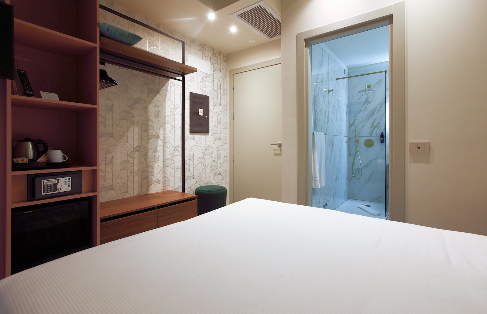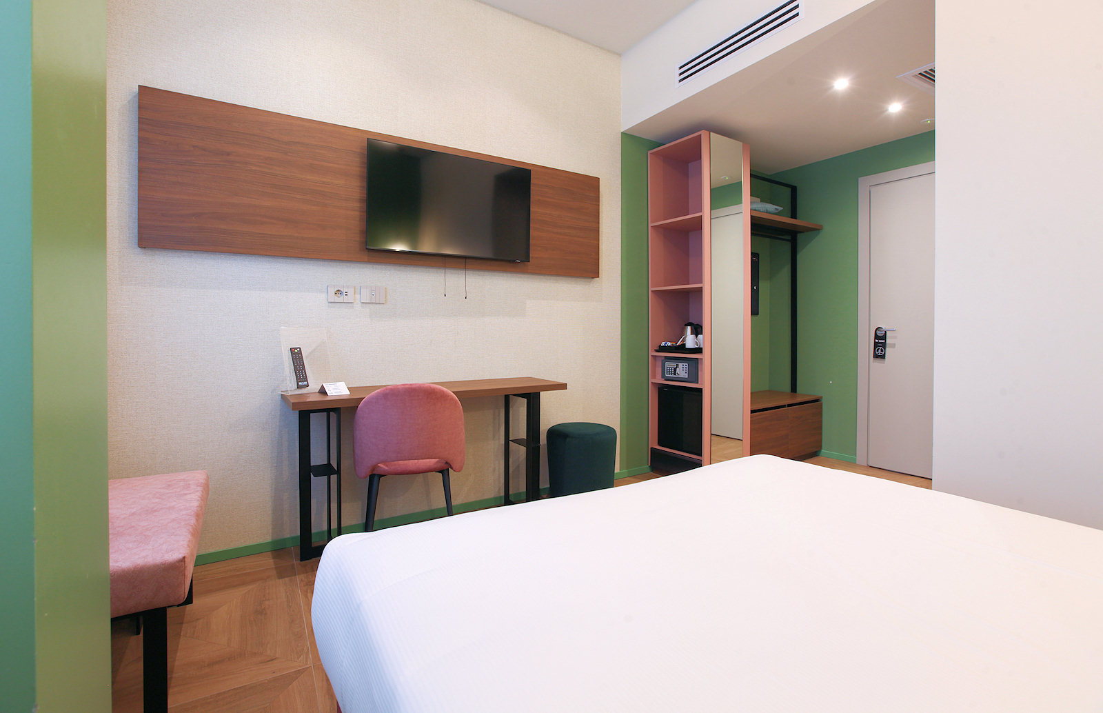 The room features a large and comfortable double bed. Amenities include air conditioning, a flat-screen TV with satellite channels, a wardrobe, USB-C ports for charging devices, a mini-fridge, a safe, and an electric kettle.
