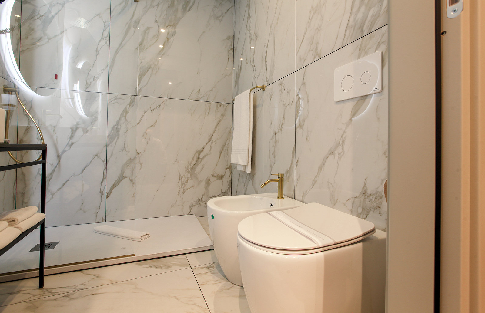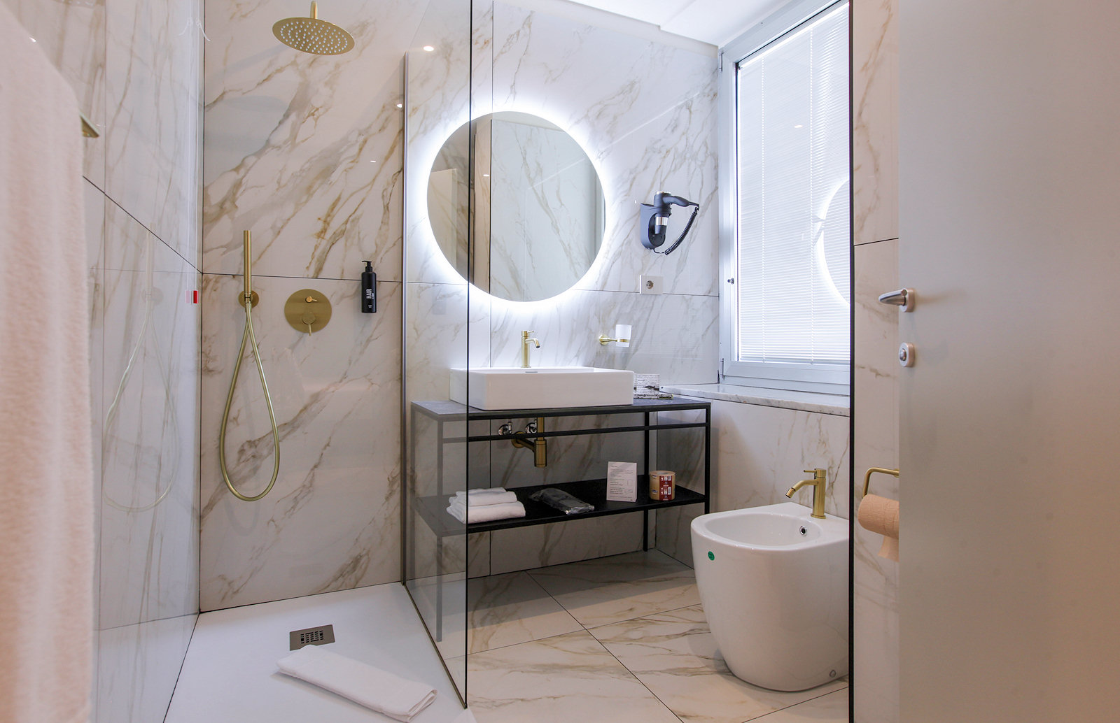 The private bathroom includes a shower, bidet, hairdryer, complimentary toiletries, and soft bathrobes.